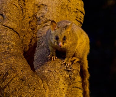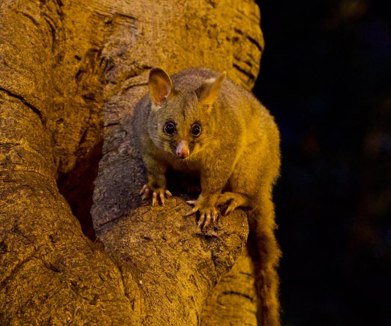 Al caer la noche, las protagonistas son las zarigüeyas. Saltan de árbol en árbol como si fueran ardillas nocturnas y aparecen en tejados con sus ojazos brillantes.Hay varias especies en Australia, pero las más comunes son la brushtail (cola peluda) y la ringtail (cola en forma de anillo). Son adorables a la vista, pero bastante territoriales: si te acercas demasiado, no dudarán en gruñirte. Lo curioso es que están protegidas por ley, así que si deciden instalarse en tu tejado… toca acostumbrarse